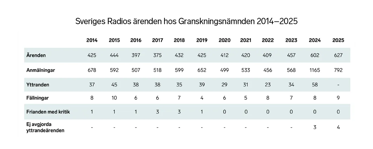 Det finns två instanser som tar emot anmälningar mot publiceringar i Sveriges Radio: Granskningsnämnden (GRN) och Medieombudsmannen (MO).